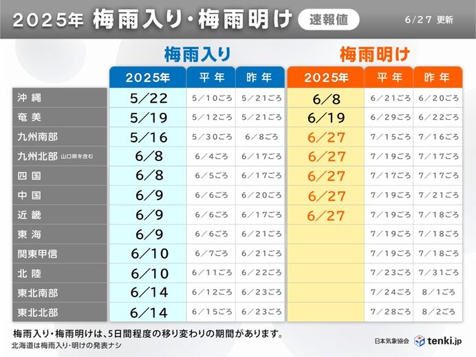 | 地方 | 2025年梅雨明け | 平年との差 | 昨年との差 | 平年 | 記録 |